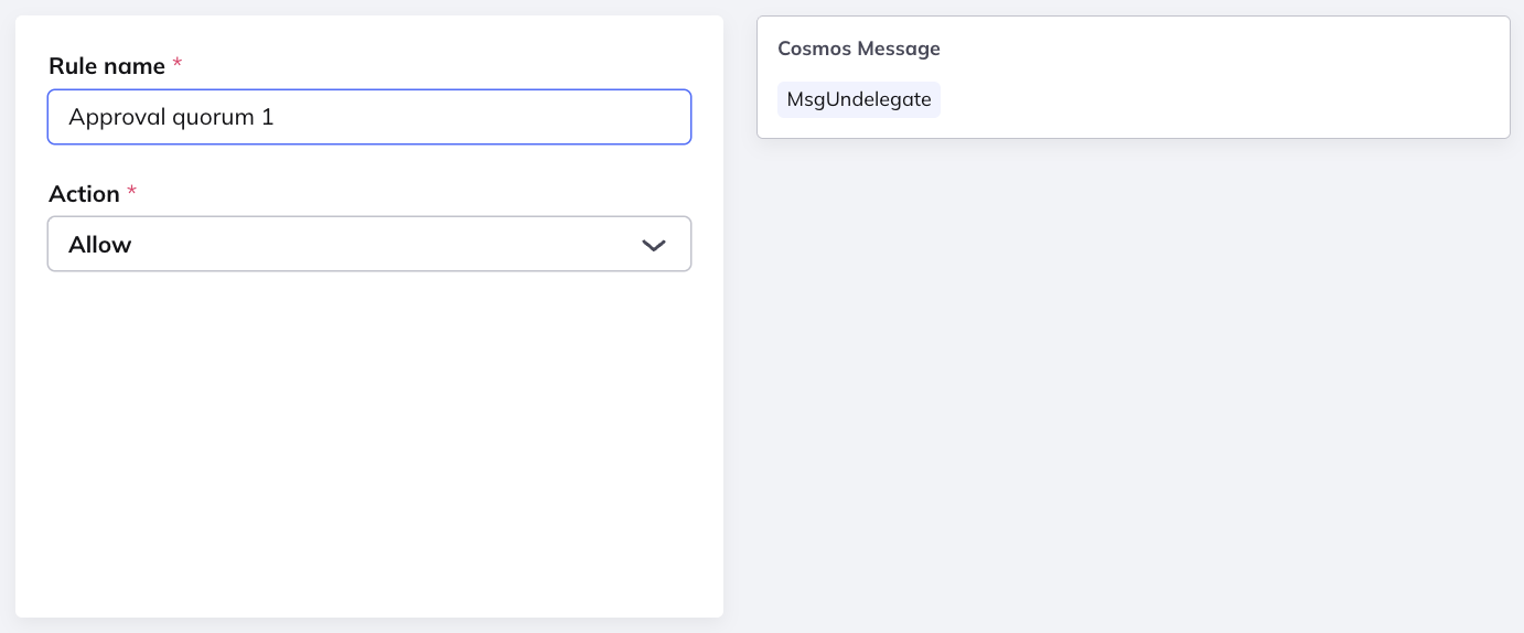 For example, suppose you wish to set a policy that requires different approval quorums for claiming staking rewards versus un-delegating your staked assets. This can be done by setting fine-grained policy rules on the MsgUndelegate message-level.